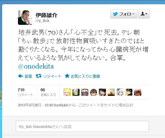 地井武男(70)さん「心不全」で死去。テレ朝「ちぃ散歩」で放射性物質吸いすぎたのではと勘ぐりたくなる。