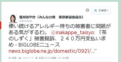 ひとつは「茶のしずく石鹸」の小麦アレルギーによる問題のツイートで、塩村議員は「使い続ける被害者に問題がある気がする」と発言。