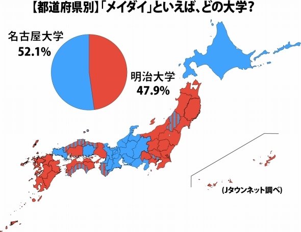 全国を集計したところ、「明大」は47.9%、「名大」が52.1%。