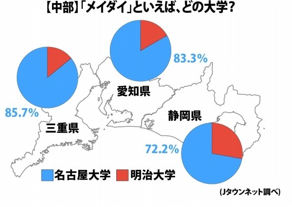 全国分布をみると、東北・関東・九州は「明大」、中部・関西は「名大」が優勢。