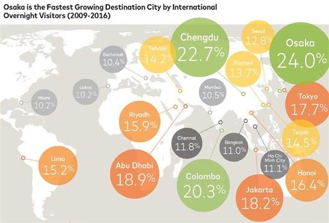 外国人旅行者の来訪(インバウンド)が増え続ける大阪。その伸び率が世界ナンバーワンであると、データで裏付けられた。クレジットカード運営の米マスターカードが9月末に発表した「2017年度世界渡航先ランキング」によると、渡航者数の成長率を比較する「急成長渡航先ランキング」で大阪が1位に輝いた。アジア勢が上位を占める中、東京や中国、韓国などの各都市を抑えての快挙だ。渡航者の人数は東京が9位、大阪は17位で、ともに前年から着実に順位を上げた。