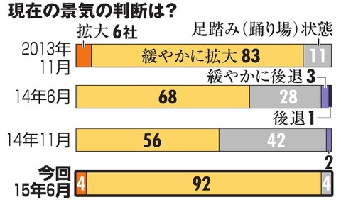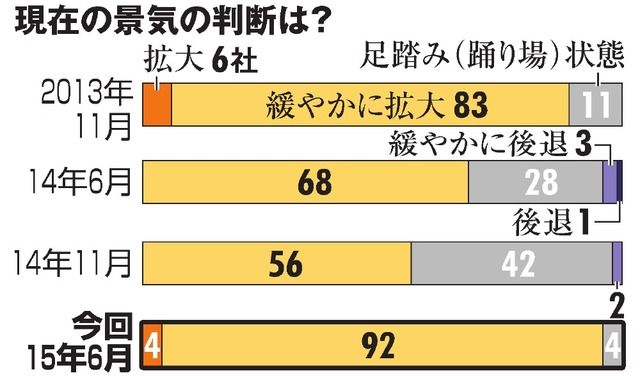 前回の14年11月調査では「拡大」はゼロ、「緩やかに拡大」は56社だった。
