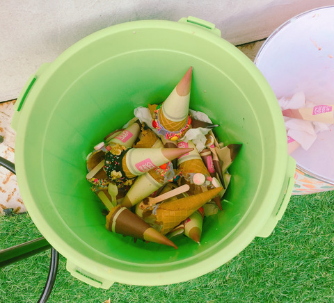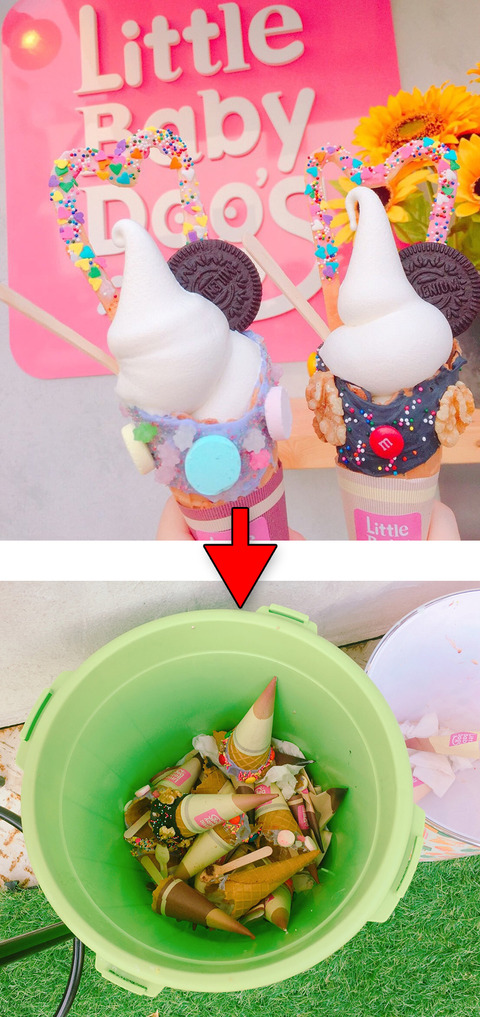 Instagramに載せるのが目的の人は可愛い写真を撮影したらあとは用済みでゴミ箱に捨ててしまうというのだ。そんな様子がTwitterに投稿されており話題になっている。店の前に置かれているバケツは本来残った紙や木の棒を捨てる物のはずだが、そこに全く手を付けていないアイスが廃棄されているのが確認できる。