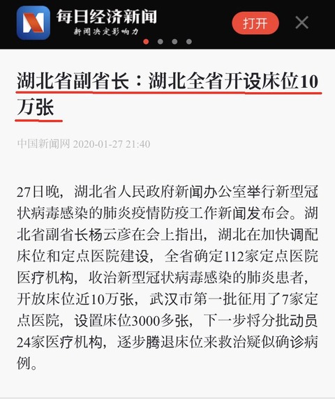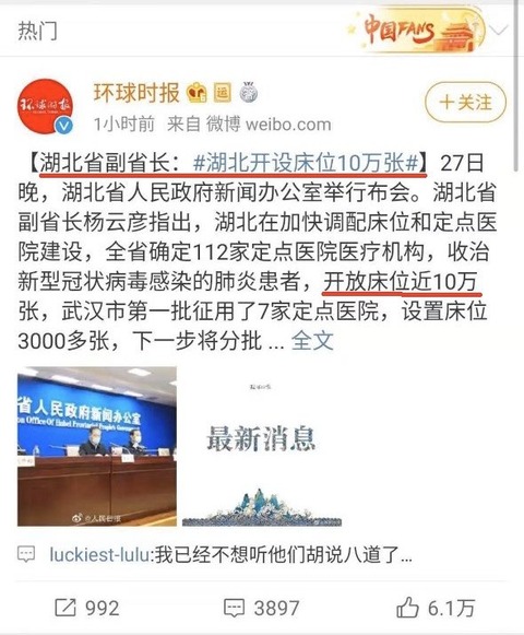 胡北副省長が「新型肺炎の患者を収容するため、胡北省全省病床10万個を開設」と発表